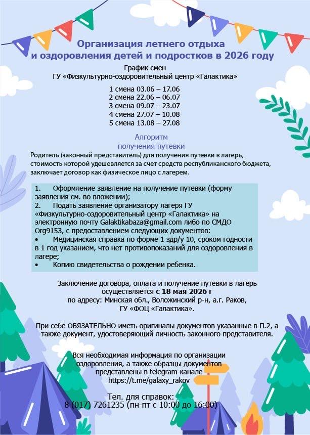 Для зачисления ребенка в лагерь с дневным пребыванием родители (лица, их заменяющие) подают письменное заявление соответственно в учреждение образования по месту учебы ребенка, специализированное учебно-спортивное учреждение, среднюю школу – училище олимпийского резерва.